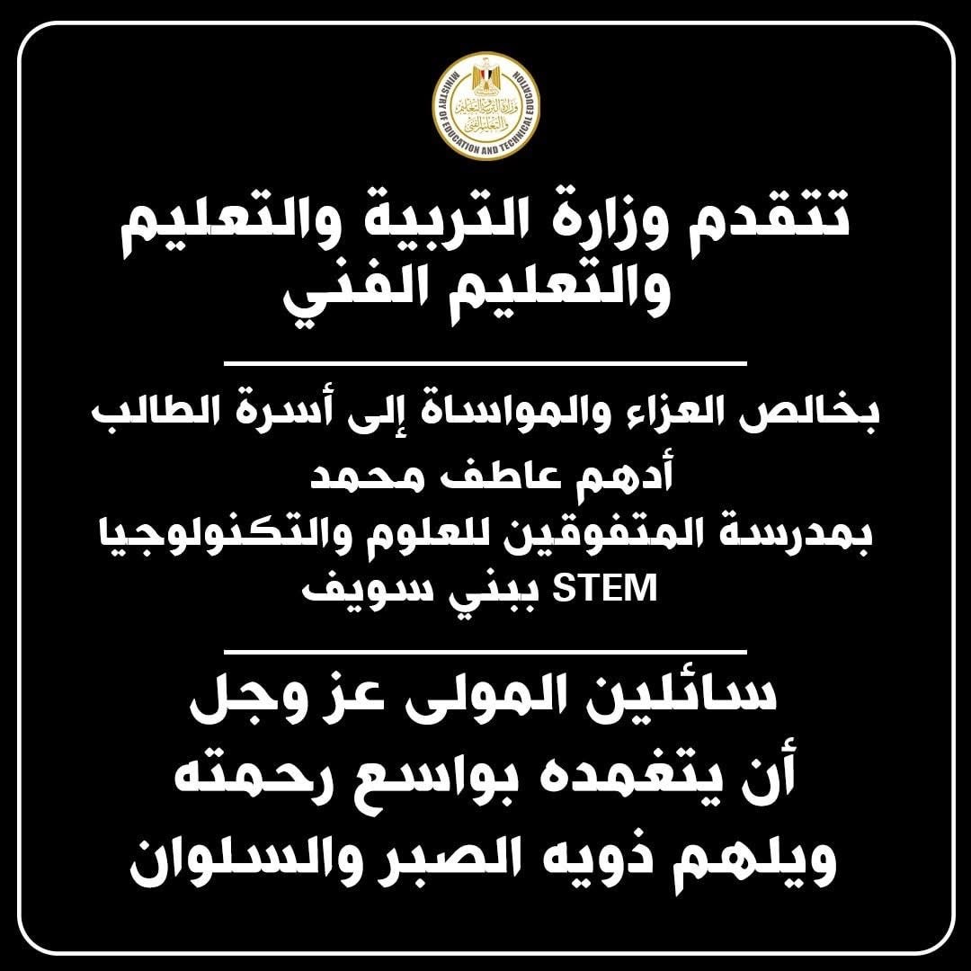 تتقدم وزارة التربية والتعليم والتعليم الفني بخالص العزاء والمواساة إلى أسرة الطالب أدهم عاطف محمد بمدرسة المتفوقين للعلوم والتكنولوجيا STEM ببني سويف، الذي وافته المنية أمس، إثر تعرضه لوعكة صحية، سائلين المولى عز وجل أن يتغمده بواسع رحمته ويلهم ذويه الصبر والسلوان.