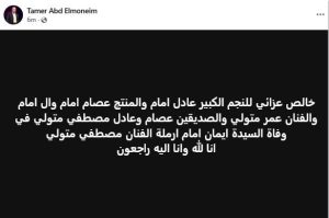 ونعي الفنان تامر عبد المنعم الراحلة قائلاً: “خالص عزائي للنجم الكبير عادل امام والمنتج عصام امام وال امام والفنان عمر متولي والصديقين عصام وعادل مصطفي متولي في وفاة السيدة ايمان امام ارملة الفنان مصطفي متولي”.