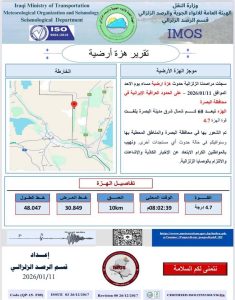 وذكرت الهيئة في بيان: “سجلنا هزة أرضية مساء اليوم الأحد على الحدود العراقية – الإيرانية تبعد مسافة 60 كم شمال شرقي محافظة البصرة، بلغت قوتها 4.7 درجة”