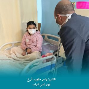 وفي محطة هامة بمستشفى الأطفال التخصصي، حرص النائب على الاطمئنان على مستوى الرعاية الصحية وتوافر الكوادر الطبية. وخلال تفقد الأقسام، قام النائب بزيارة خاصة للطفلة “أسيل” للاطمئنان على حالتها الصحية ومتابعة سير علاجها، مؤكداً على تقديم الدعم الكامل لضمان حصولها وكافة الأطفال على أفضل عناية ممكنة.